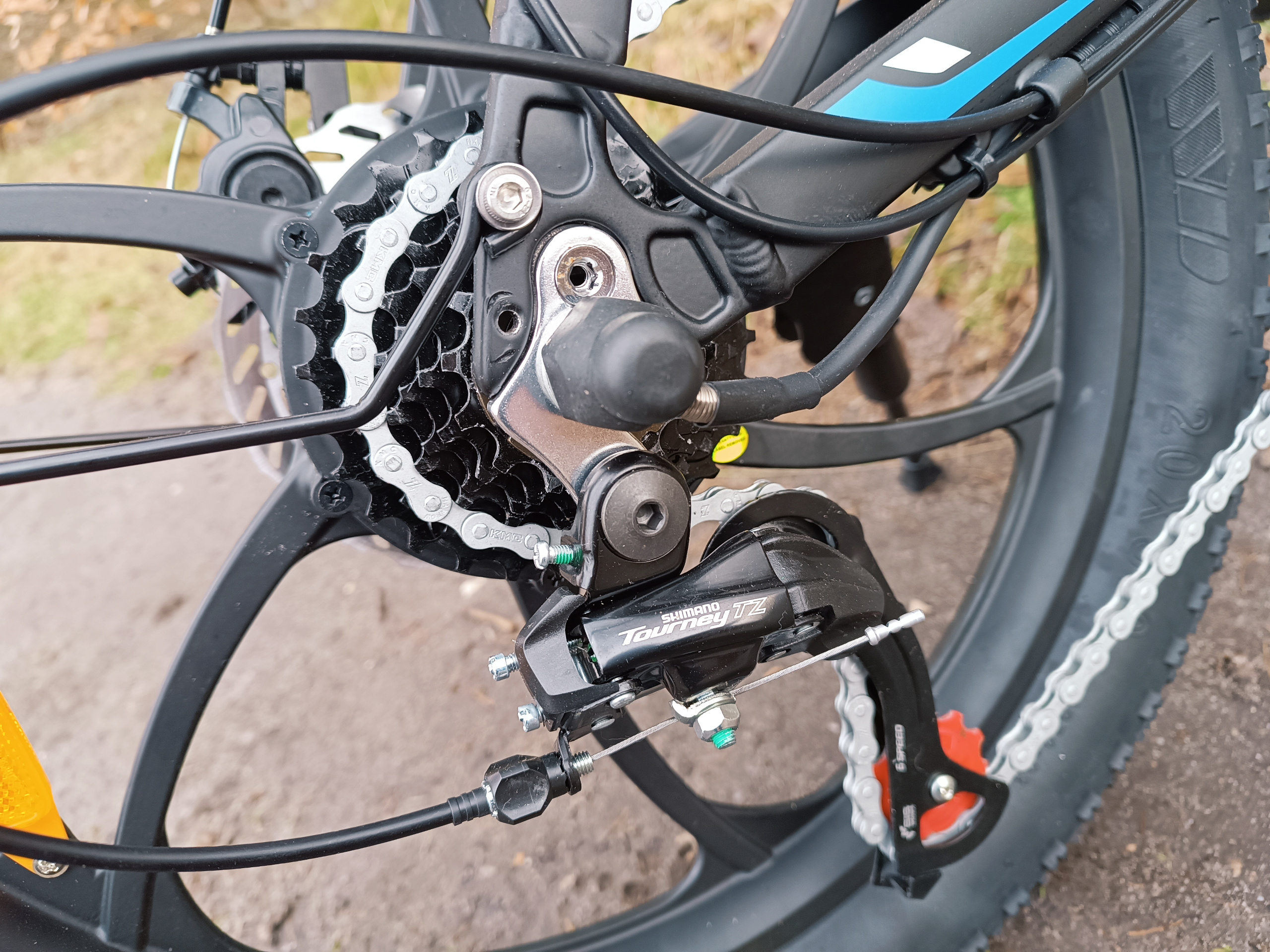 Das 7-Gang-Shimano Tourney Schaltwerk, kombiniert mit den Shimano Tourney Schalthebeln, hat während meines Tests tadellos funktioniert und seine Aufgabe unauffällig erfüllt. Das Hoch- und Runterschalten verlief einwandfrei. Angesichts des leistungsstarken Hinterradmotors halte ich die verfügbaren 7 Gänge für absolut ausreichend. Das Schalten der Gänge lässt sich bequem mit einem Daumen steuern.